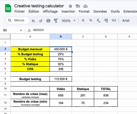 Nombre de créas à tester = 20 000 / 150 = 133 nouvelles publicités par mois.