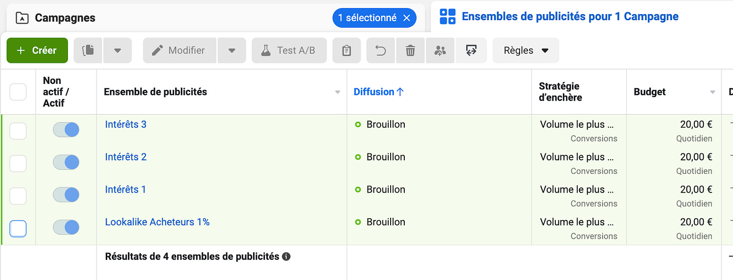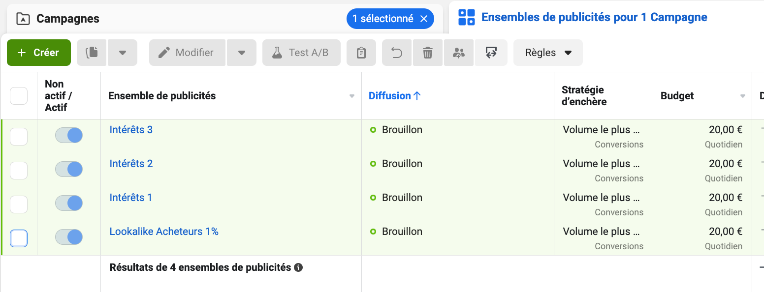 Si vous voulez par exemple tester 4 audiences pour identifier celle qui fonctionne le mieux, vous pouvez créer 4 ensembles de publicités (1 par ciblage) et leur attribuer chacun le même budget :